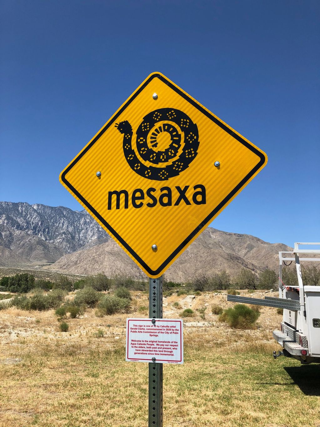 One of the original hand painted road signs installed on the Cahuilla Indian Reservation.