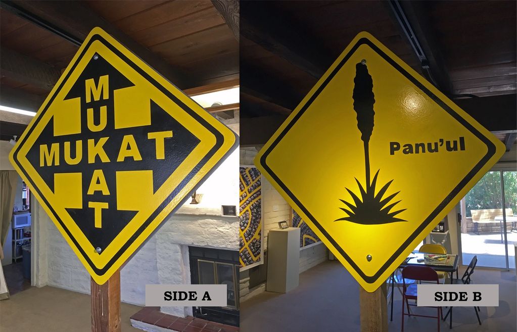 Two of the last hand painted signs I created featuring the name of our Creator (MUKAT) and the Yucca Whipplei plant (Panu'ul).
